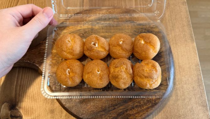 ①まずはそれっぽい容器にシュークリームを並べましょう。これだけでも既にたこ焼きっぽいですね笑