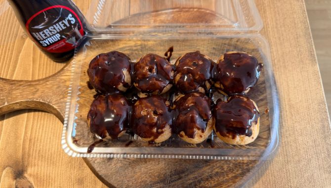 ②チョコシロップでソースを演出。あらまぁ美味しそ(たこ焼きとして)
